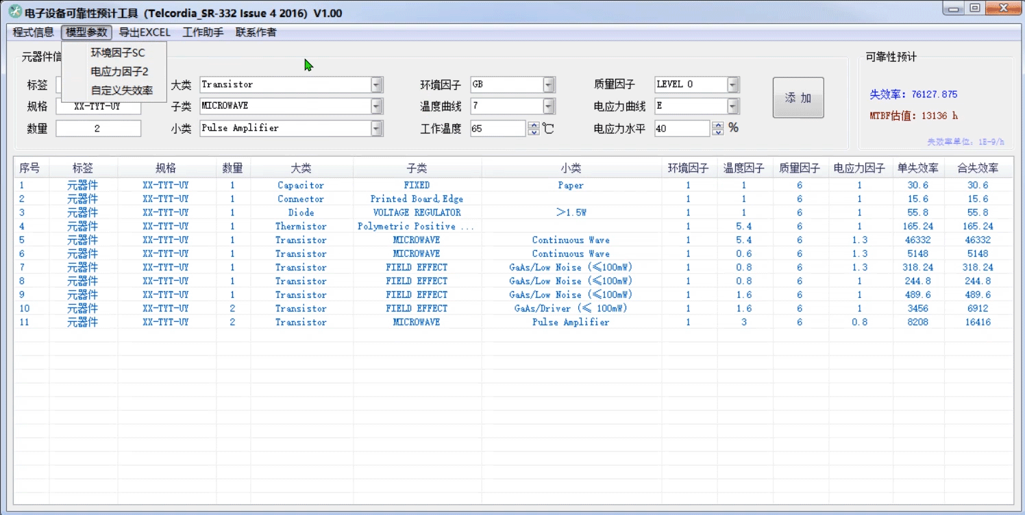 651031995 lv4lv4 22年10月18日 根据Telcordia SR-332规范做了一个计算程式,主要实现以下功能特性: ①内置SR-332 Issue 4 2016全部失效率库文件 ②支持双电应力因子 ③支持自定义环境因子 ④支持用户失效率录入 ⑤温度因子+电应力因子自动分配计算 ⑥表格展示,支持右键删改 ⑦实时展示单体失效率,合并失效率 ⑧实时预估产品MTBF/MTTF ⑨支持快速导出Excel文档附件 ⑩win版绿色EXE,无需插件和安装,即下即用 social_1666746922502@651031995 lv1lv1 22年10月26日 请问如何下载软件?